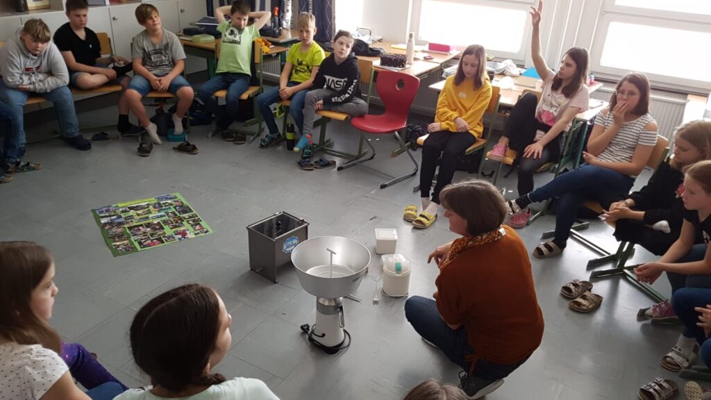 Im Rahmen des Chemieunterrichtes bekamen die Schülerinnen und Schüler der 4a Klasse eine Anleitung zum Apfelsaftpressen – Äpfel waschen, zerkleinern, pressen, filtrieren und anschließend pasteurisieren, um ihn haltbar und lagerfähig zu machen.